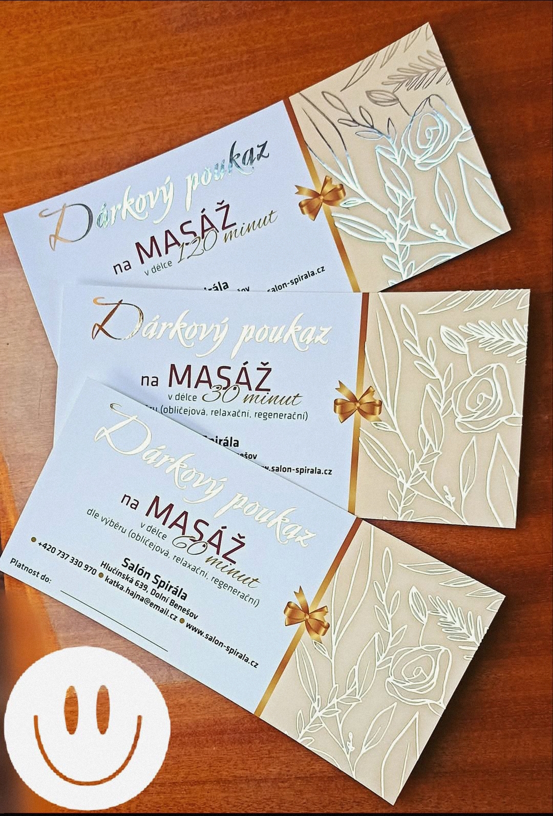Dárkové poukazy jsou k dispozici spolu s ozdobnými obálkami. Dárkový poukaz je možno zakoupit také na hodnotu, kdy na poukazu bude vyznačena částka, za kterou může obdarovaný absolvovat masáže, až do vyčerpání částky. Možnost vyzvednutí poukazu - po domluvě v salónu, na vrátnici MSA, a.s., případně mohu zaslat poštou po zaplacení částky předem na účet. Délka platnosti poukazu je půl roku od měsíce jeho zakoupení. Více v oddíle Všeobecné obchodní podmínky.